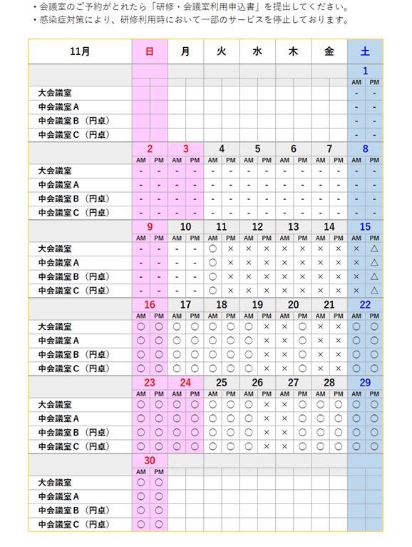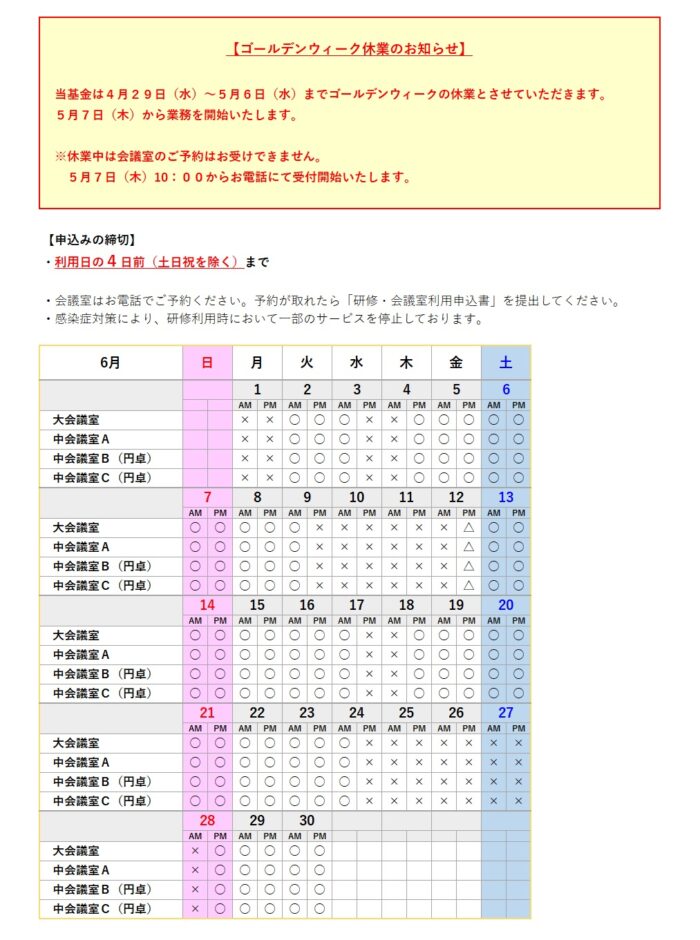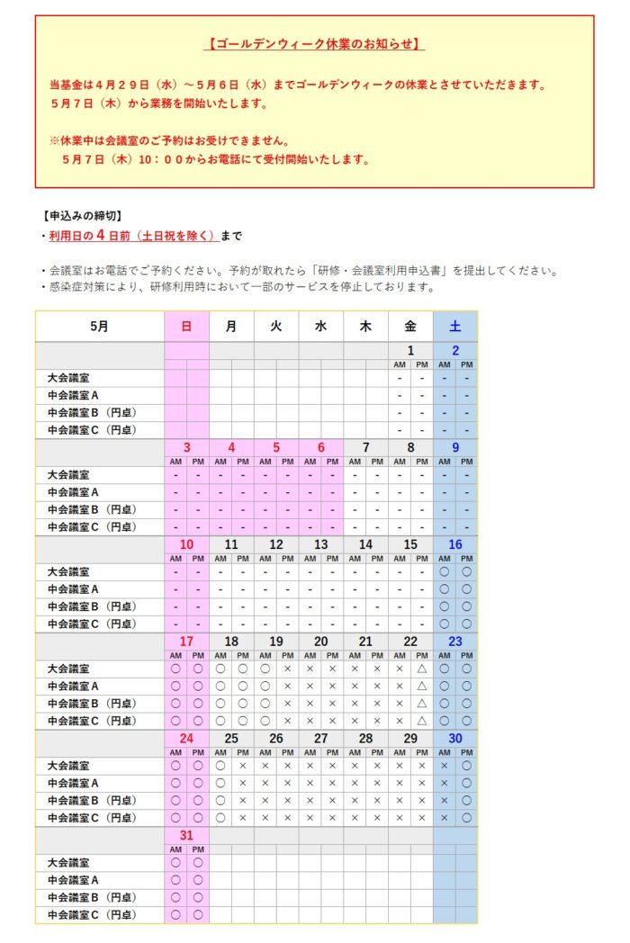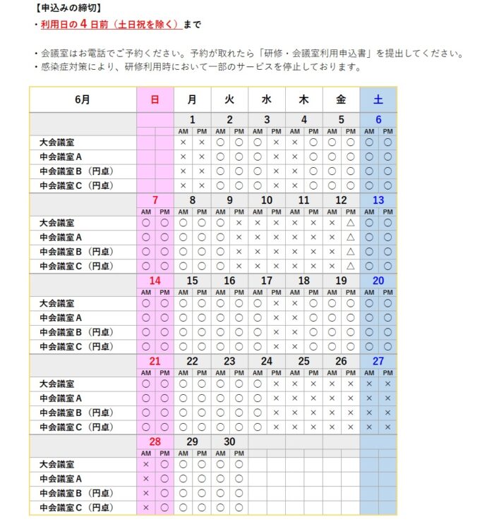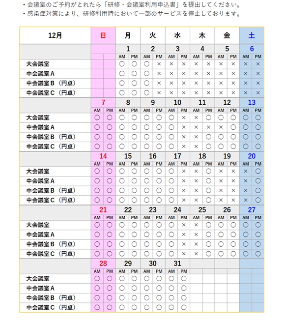- 申込方法の詳細は、『予約について』ー「会議・研修の利用について」のページをご覧ください。
