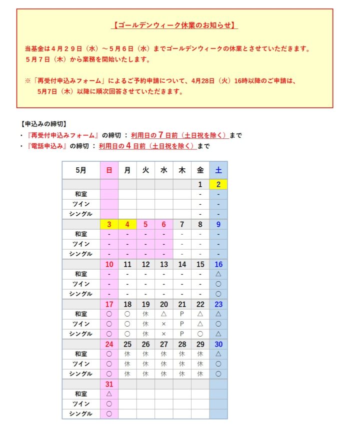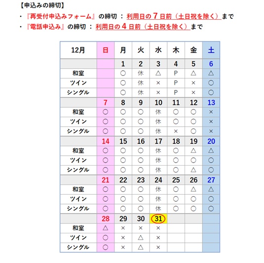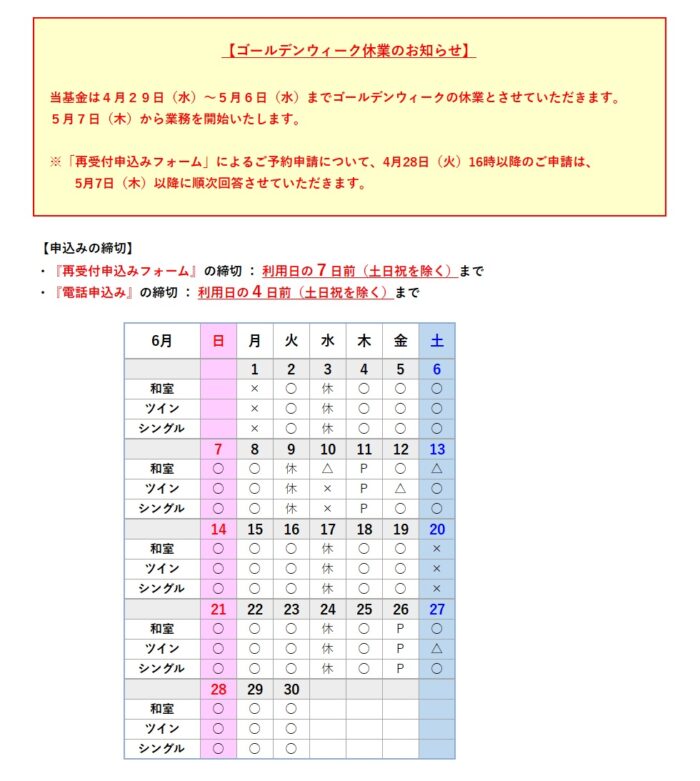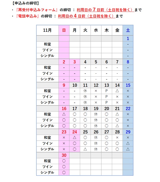 - 空室の予約は、再受付申込みフォーム または お電話 でお申込みください。