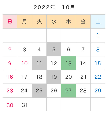 | 10月 | 7/1(月)~ 7/20(土) | 8/9(金)~ | |||