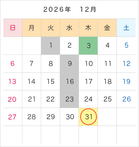| 2026年 | 4月 | 2026年 | 1/1(木)~ 1/20(火) | 2026年 | 2/10(火)~ |