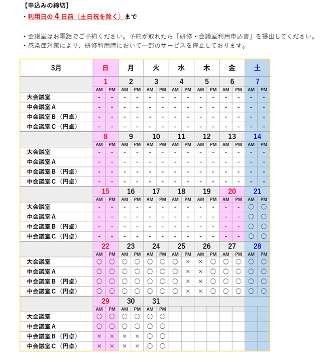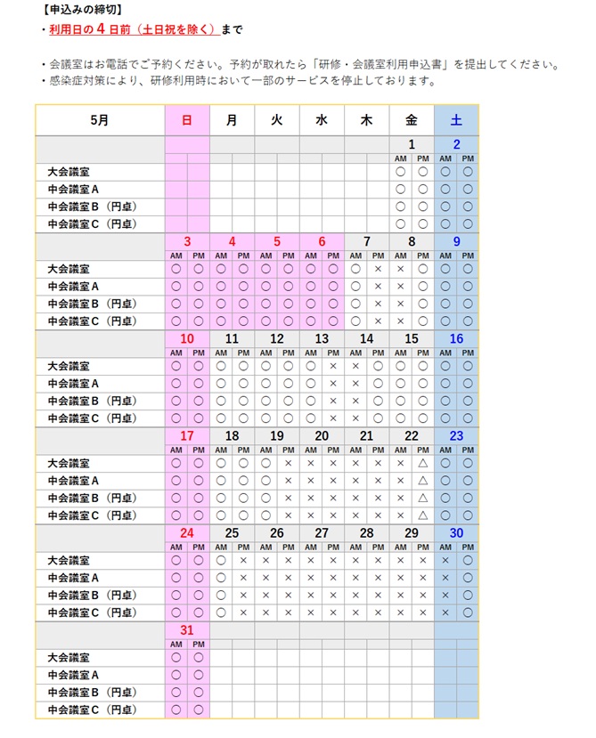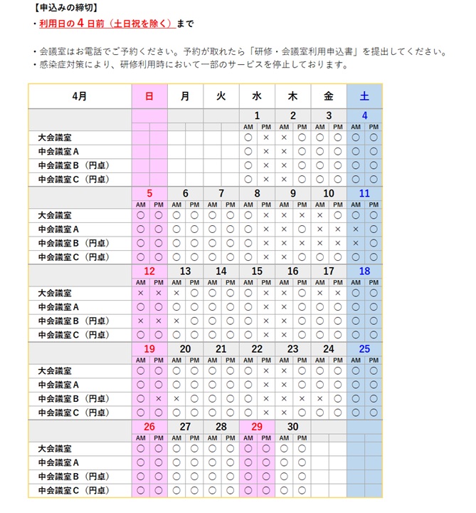 - 申込方法の詳細は、『予約について』ー「会議・研修の利用について」のページをご覧ください。