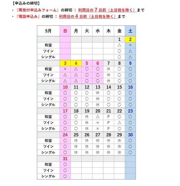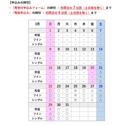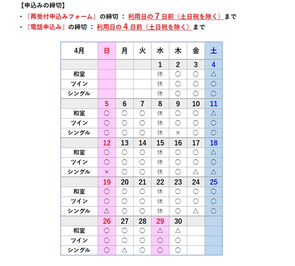 - 空室の予約は、再受付申込みフォーム または お電話 でお申込みください。